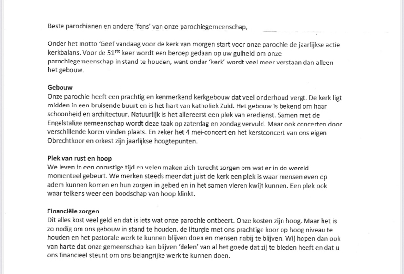 Regelmatig verschijnt de Obrechtinfo: een actuele nieuwsbrief met daarin het laatste nieuws uit kerk en parochie. Schrijf u hier in om de nieuwsbrief per e-mail te ontvangen.