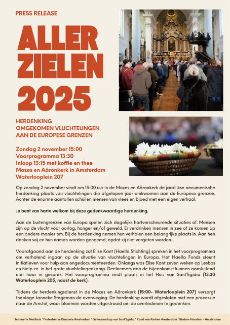 Traditionele 2 november herdenking in de Mozes en Aäron: Al enkele jaren is het een bijzonder initiatief; de herdenking van vluchtelingen die aan de randen van Europa zijn omgekomen. Dit gebeurt tijdens de Allerzielenviering in de Mozes en Aäronkerk hier in Amsterdam. Dit jaar op zondag 2 november om 15.00 uur. Voor meer informatie verwijs ik u naar de flyer bij deze Obrechtinfo.