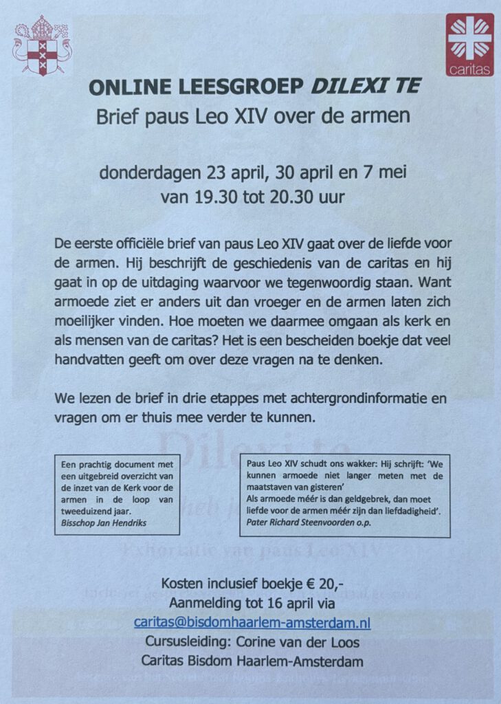 We zijn allemaal natuurlijk verontrust door de escalatie van oorlogshandelingen in het Midden-Oosten. Paus Leo XIV heeft afgelopen zondag een hartstochtelijk beroep gedaan op alle betrokken partijen om de spiraal van geweld te stoppen en in te zetten op diplomatie. Hij heeft ons opgeroepen om te bidden om vrede. Daarom voeg ik het gebed hierbij dat onze paus deze week heeft gegeven en nodig U uit U hiermee te verenigen.